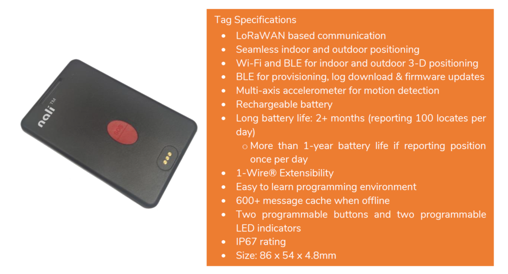 It is a low power, credit card size, indoor and outdoor location device. Nali-100 can be used as an enterprise asset tracking device, an employee safety badge or a student card with an emergency button.